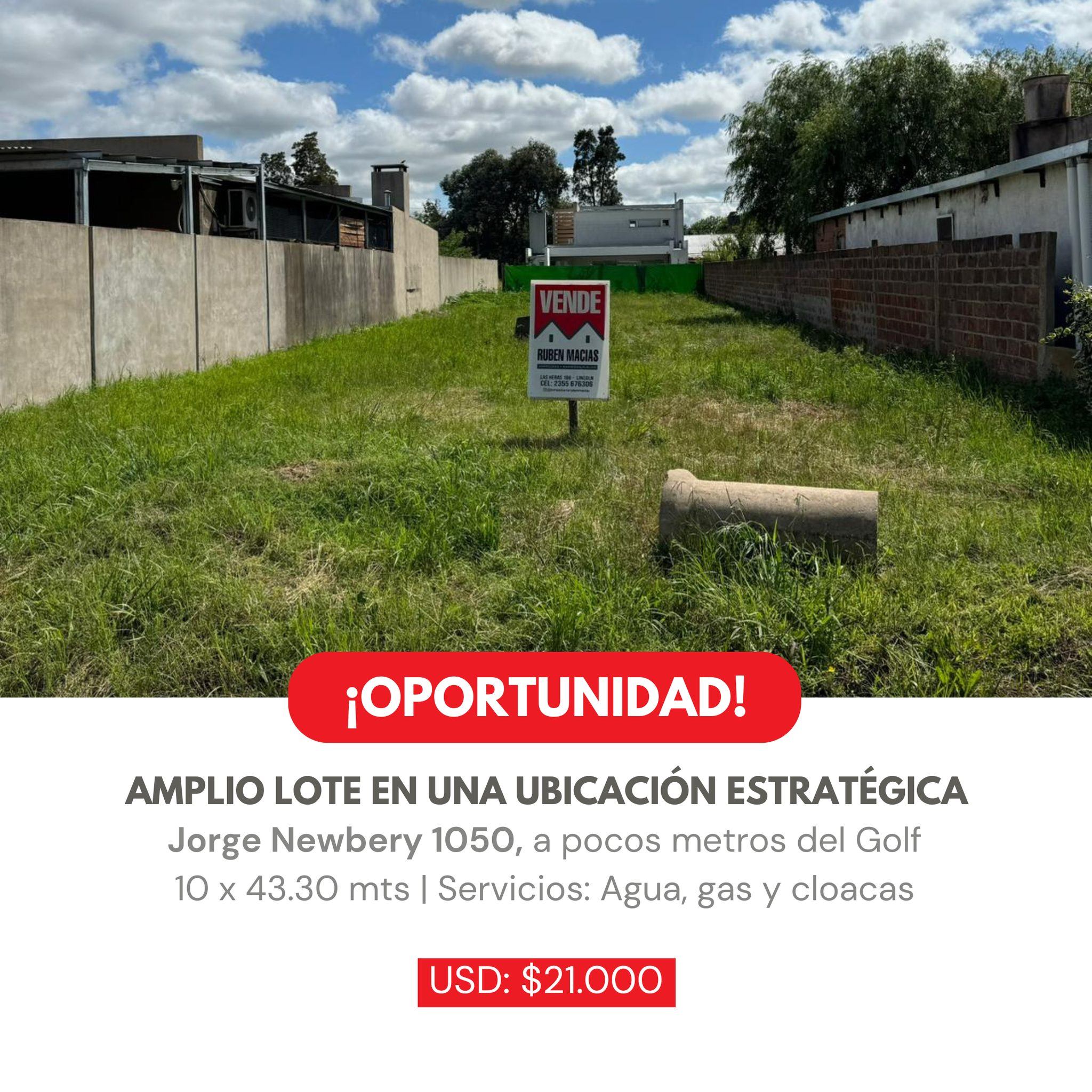 ¡OPORTUNIDAD! Jorge Newbery 1050 Amplio lote en una ubicación estratégica, a pocos metros del Golf. Medidas: 10 x 43.30 mts Servicios: Agua, gas y cloacas USD 21.000 ¡No dejes pasar esta oportunidad única para invertir o construir tu hogar ideal! Las Heras 154, Lincoln (02355) 432504