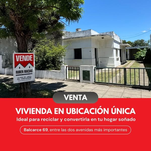 VIVIENDA EN VENTA Ubicación única en Balcarce N°69, entre las dos avenidas más importantes de la ciudad. Lote: 550 m² Superficie cubierta: 192 m² Ideal para reciclar y convertirla en tu hogar soñado! ¡Aprovechá esta increíble oportunidad! Las Heras 154, Lincoln (02355) 432504