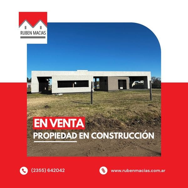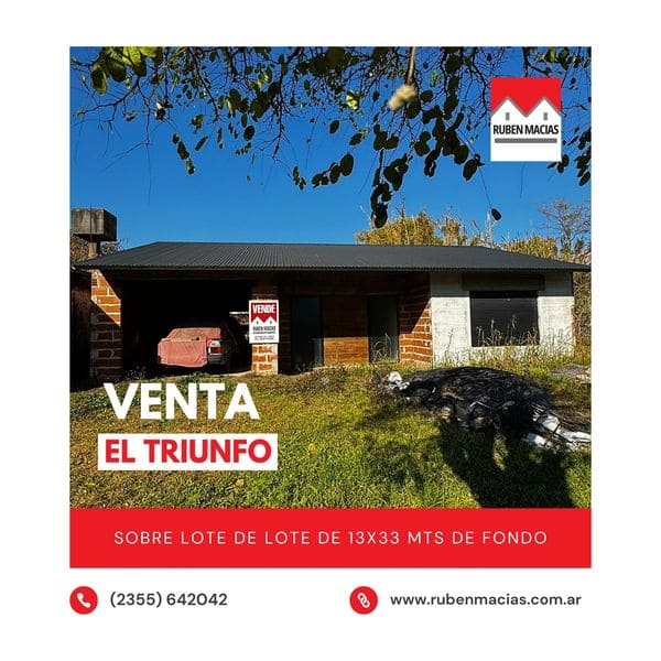 ¡EN VENTA! Vivienda céntrica en la Ciudad de El Triunfo Ubicación privilegiada Lote de 13×33 mts 120 m2 cubiertos Living comedor cocina Baño Dos dormitorios Cochera para dos vehículos 75% de avance de obra Materiales de primera calidad ¡La oportunidad perfecta para terminar tu hogar a tu gusto en una excelente ubicación!