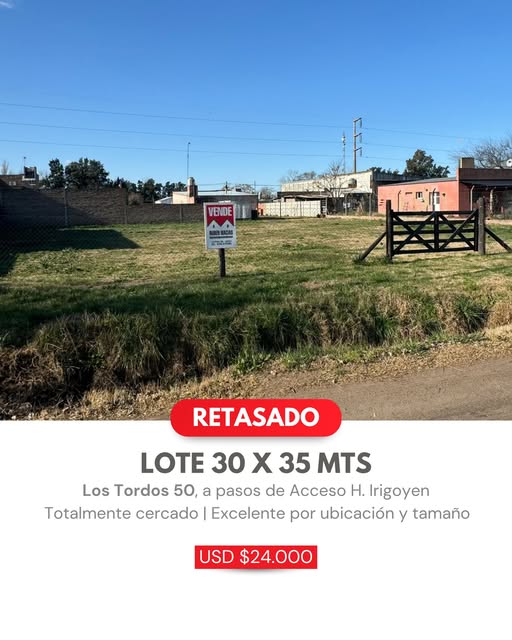 ¡LOTE RETASADO! Los Tordos 50, a pasos de Acceso H. Irigoyen ¡Excelente por ubicación y tamaño! 30 x 35 mts Totalmente cercado ¡Oportunidad única! Contáctanos Las Heras 154, Lincoln (02355) 432504